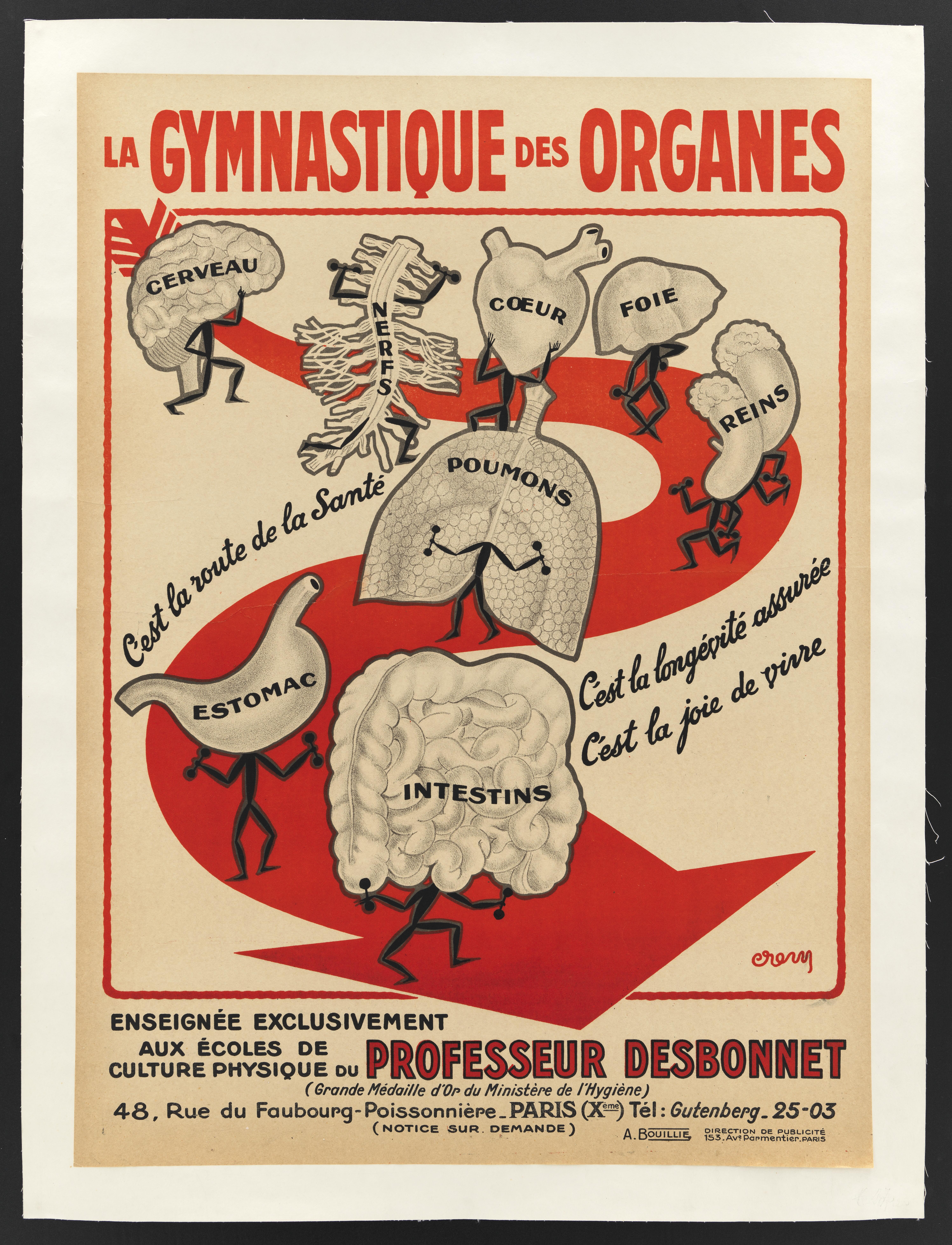 The following poster comes courtesy of the Wellcome Trust Library and details the famous French physical culturist Edmond Desbonnet’s efforts to educate consumers on the importance of physical culture for the body.
