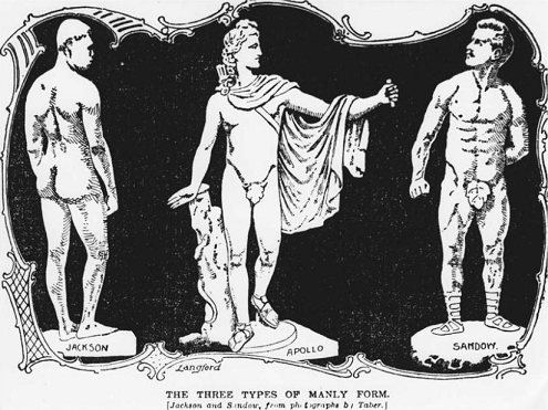 Peter Jackson to my mind approaches the nearer the elegant proportions of the old Greek statues than Sandow. The lines of his contour of figure are more finely drawn, more delicate than those of Sandow.